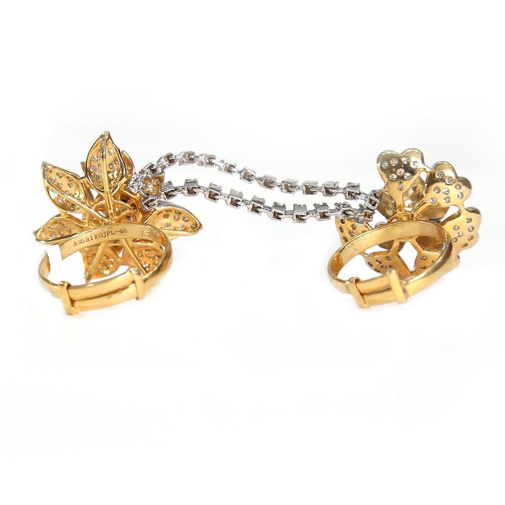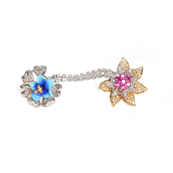 An Ornate piece by Krown Kouture, La Unison exhibits the delicate yet classy feminine appeal. This ring connects and unites two fingers and symbolizes strength. The flower and the star make for the perfect design and sparkle. The blue flower sitting in heart-shaped diamonds connected to a pink diamond resting on a gold star. Awe-inspiring indeed.