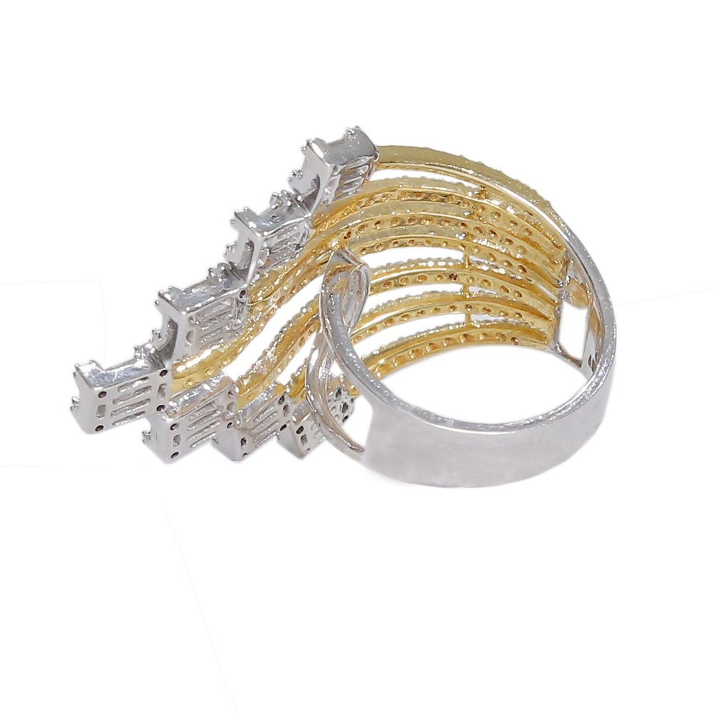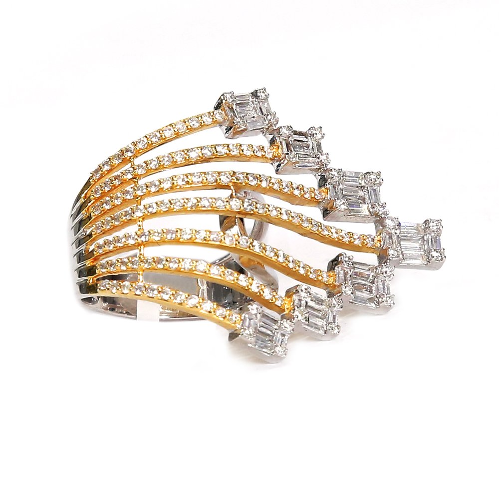 The brilliantly-cut diamonds arranged in a circle lend the uniqueness to the design. The exclusive diamonds add to the luxurious charm. The ring has been meticulously rendered by our adept craftsmen with a skillful lineage. The handpicked diamonds and the lustrous gold have been handcrafted into a state-of-the-art piece. It is a classic motif to showcase your romance for your loved ones and make them feel like royalty.